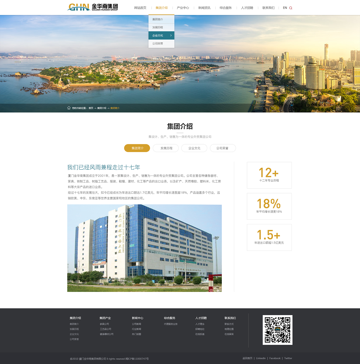 厦门金华南集团成立于2001年,是一家集设计、生产、销售为一体的专业外贸集团公司。公司主营各种健身器材、家具、铁制工品、树脂工艺品、服装、鞋帽、建材、化工等产品的出口业务,以及矿产、天然橡胶、塑料米、化工原料等大宗产品的进口业务。经过十七年的发展壮大,如今已经成长为年进出口额达1.7亿美元,年平均增长速度超18%,产品涵盖多个行业,远销欧美、中东、东南亚等世界主要国家和地区的集团公司。