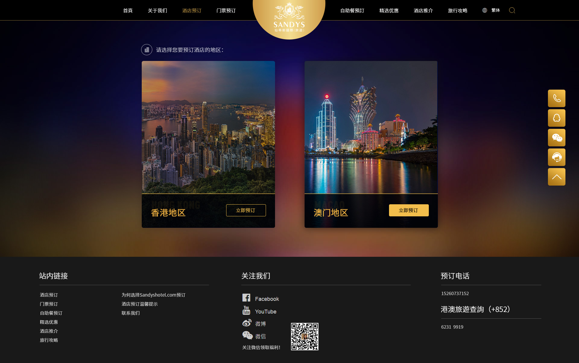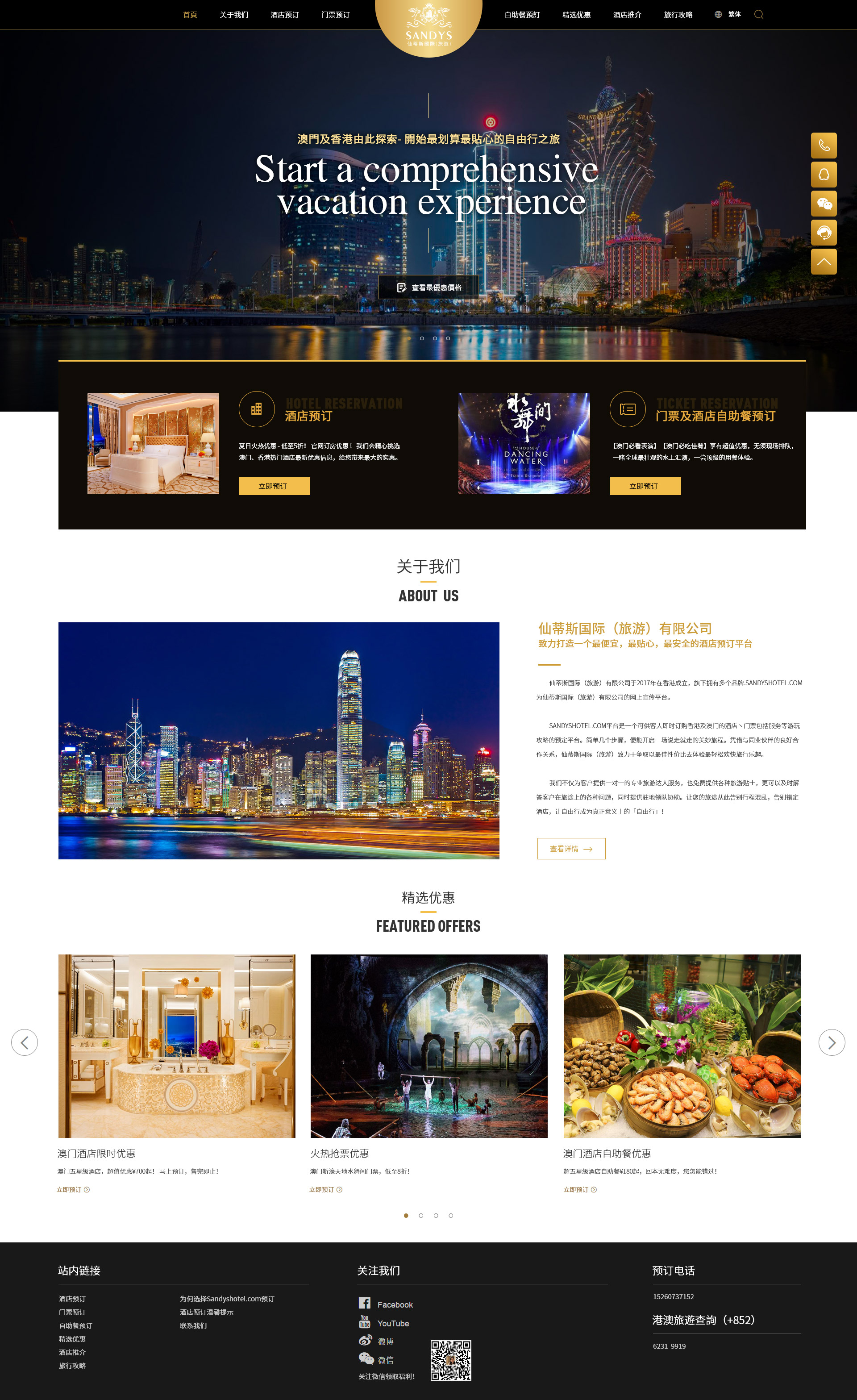 SandysHotel.com仙蒂斯国际(旅游)有限公司于2017年在香港成立,旗下拥有多个品牌。 Sandyshotel.com为仙蒂斯国际(旅游)有限公司的网上宣传平台。Sandyshotel.com平台是一个可供客人即时订购香港及澳门的酒店、门票包括服务等游玩攻略的预定平台。简单几个步骤,便能开启一场说走就走的美妙旅程。凭借与同业伙伴的良好合作关系,仙蒂斯国际(旅游)致力于争取以最佳性价比去体验最轻松欢快旅行乐趣。