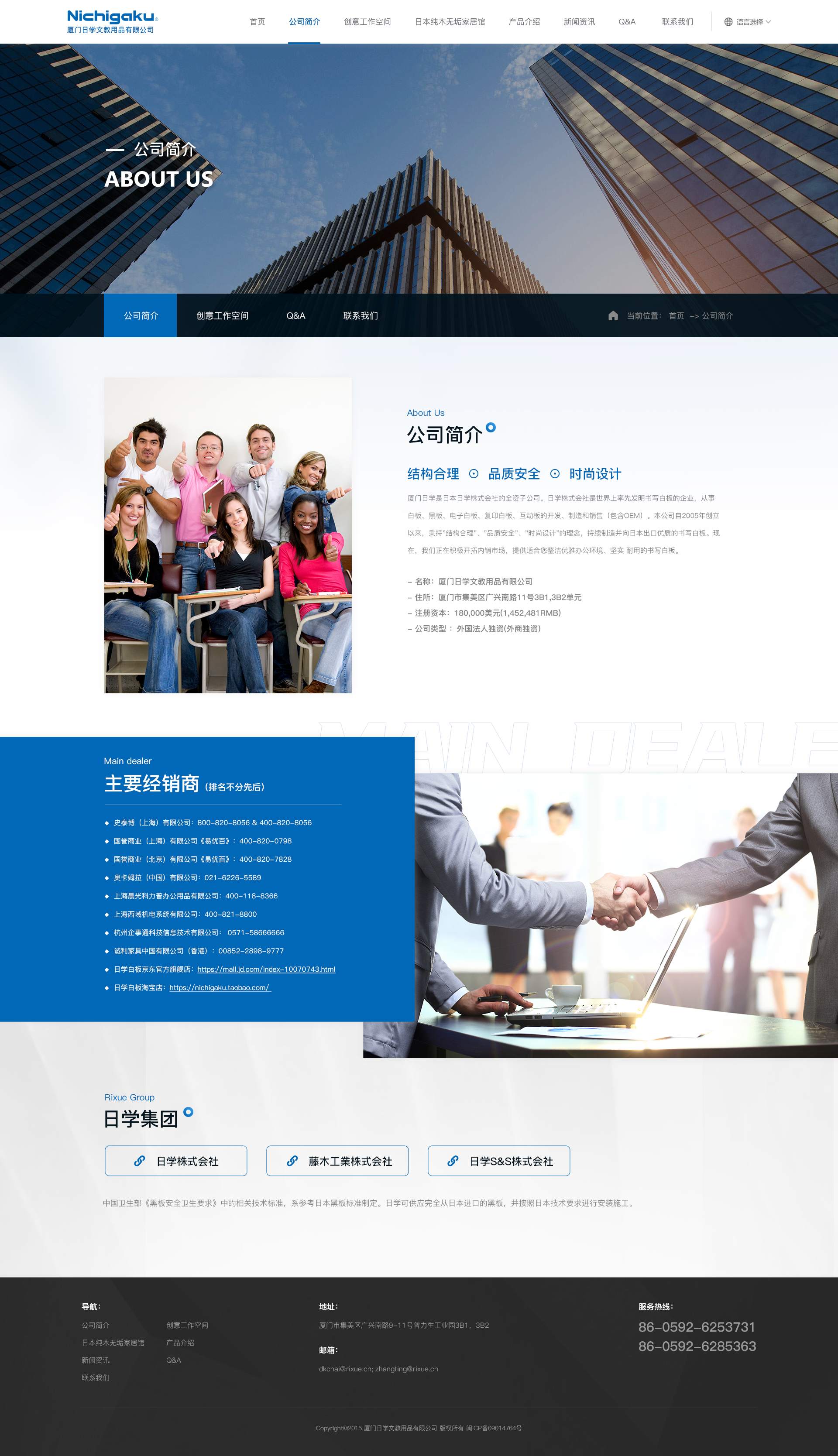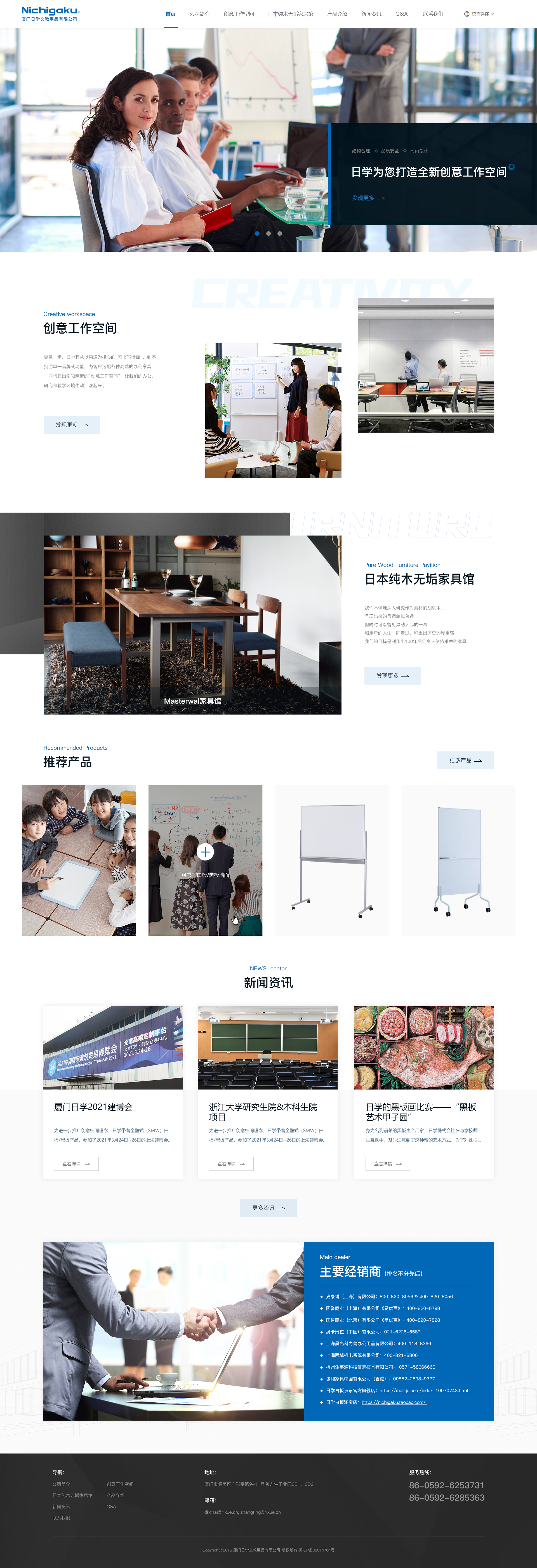 厦门日学是日本日学株式会社的全资子公司。日学株式会社是世界上率先发明书写白板的企业,从事白板、黑板、电子白板、复印白板、互动板的开发、制造和销售(包含OEM)。本公司自2005年创立以来,秉持"结构合理"、"品质安全"、"时尚设计"的理念,持续制造并向日本出口优质的书写白板。现在,我们正在积极开拓内销市场,提供适合您整洁优雅办公环境、坚实 耐用的书写白板。